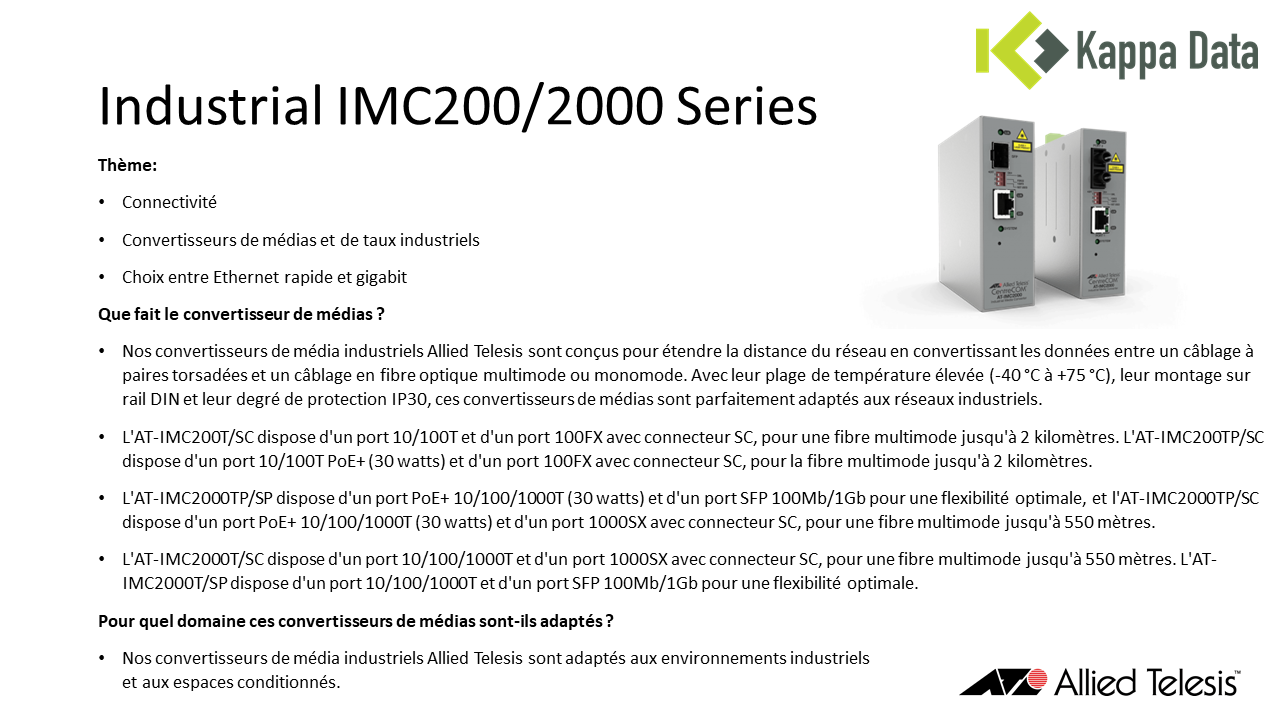 Les convertisseurs de média industriels d’Allied Telesis sont conçus pour étendre la distance du réseau. La plage de température élevée (-40°C à 75°C), la conception d’alimentation redondante et les capacités de protection IP-30 font de ces convertisseurs de médias une solution parfaite pour tous les réseaux industriels.